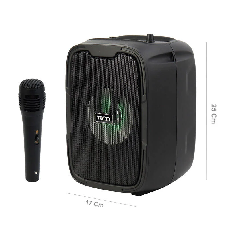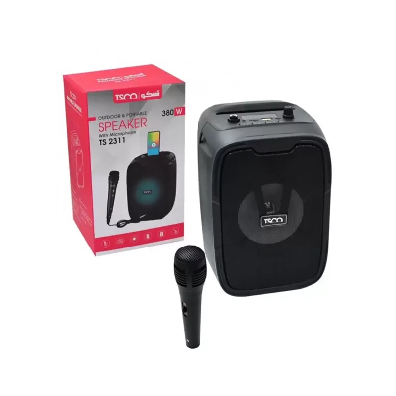 اسپیکربلوتوثی تسکو مدل TS 2311 از یک پورت USB، ورودی میکروفن و درگاه AUX پشتیبانی میکند. این محصول از لحاظ ظاهری بسیار جذاب و بروز بوده و به رنگ مشکی به بازار عرضه شده است. نورپردازی RGB روی بلندگوی این اسپیکر زیبایی بصری زیادی به آن بخش است. همچنین ابعاد فیزیکی اسپیکر 2311 برای یک اسپیکر بلوتوثی و قابل حمل مناسب است. جنس بدنه این میکروفن نیز از پلاستیک با کیفیت است. وزن این اسپیکر 1575 گرم بوده و با توجه به قابلیتهایی که دارد و وجود میکروفن منطقی به نظر میرسد. این اسپیکر بلوتوثی تا فاصله 10 متری قابلیت اتصال به دستگاه مورد نظر شما را دارد.