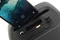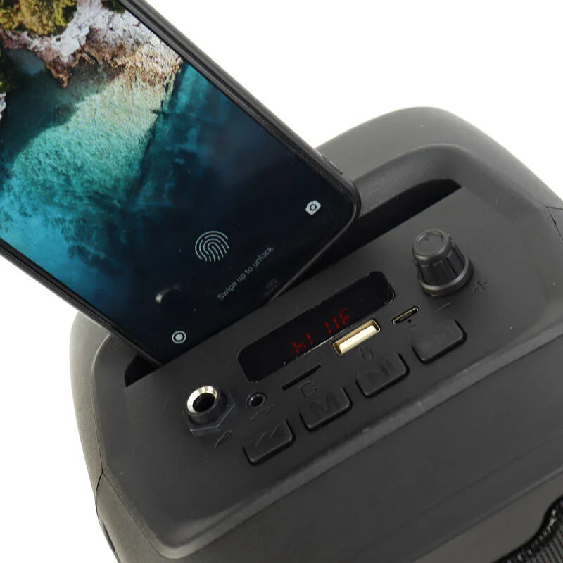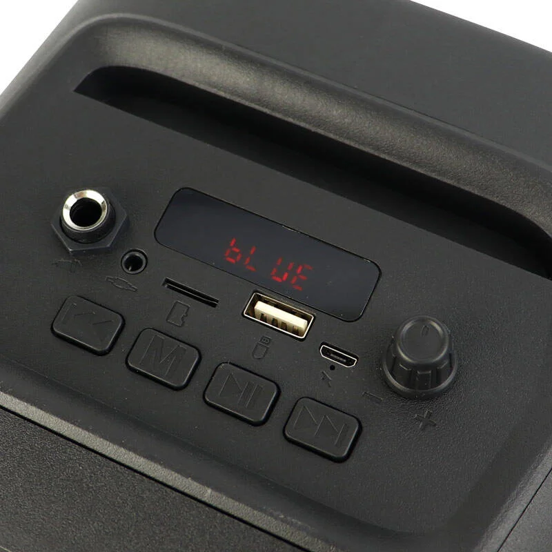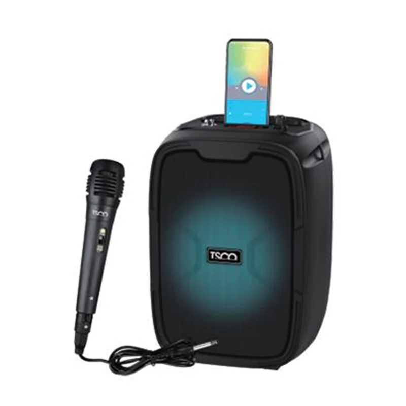 شما از طریق درگاه Micro USB میتوانید اسپیکر را شارژ کنید. در طراحی این اسپیکر در بخش بالایی دستگاه بخش تنظیمات اسپیکر قرار گرفته که شامل ورودی میکروفن، پورت AUX، یک درگاه USB و درگاه TF هست تا شما بتوانید به طرق مختلف موسیقی دلخواه خود را گوش دهید. علاوه بر اینها یک مانیتور جهت نمایش مود پخش و شماره آهنگ نیز قرار دارد. در کنار اینها 4 دکمه برای پخش آهنگ و تییر حالت پخش و همچنین عقب و جلو زدن آهنگ روی این اسپیکر تعبیه شده است. یک بخشی نیز برای زیاد و کم کردن صدا در نظر گرفته شده است. اسپیکر تسکو TS 2311 دارای یک دسته برای حمل بوده که کار شما را بسیار راحتتر میکند. همچنین شرکت تسکو با طراحی میکروفن به رنگ مشکی و طلایی بوده و سعی کرده تا جذابیت بصری این میکروفن را بالا ببرد. و میتوان گفت تا حد زیادی نیز موفق بوده است. نورپردازی RGB هنگام روشن کردن این اسپیکر خودنمایی میکند که زیبایی خاصی به این دستگاه بخشیده است.